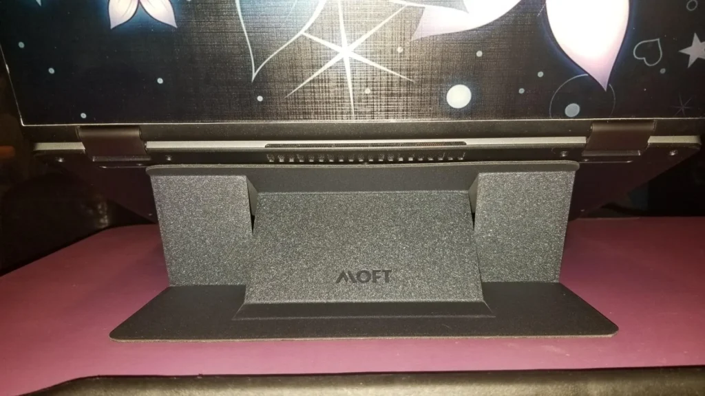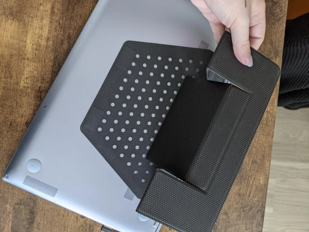 The first thing I noticed was how thin this stand really is at just 3 millimeters. It is crafted from a mix of vegan leather and fiberglass, giving it a high-end feel that matches the premium aesthetic of most modern laptops. In my testing, the build quality felt surprisingly rigid despite the slim profile. Unlike traditional aluminum stands that take up half your bag, this one integrates directly onto the bottom of your device. It feels like a natural extension of the machine rather than a separate piece of hardware.