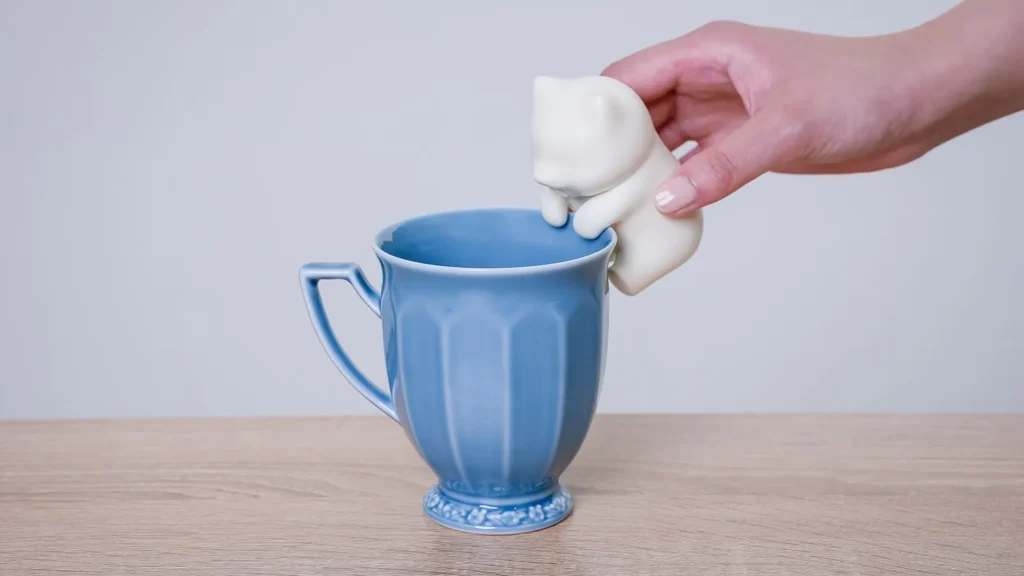 The Nékojita FuFu is essentially a palm-sized robot shaped like a minimalist cartoon cub. In my hands, the silicone exterior feels incredibly soft and premium which is a nice touch for something meant to sit near your face. It is light enough that it does not make my favorite thin ceramic mugs feel top-heavy or prone to tipping over. The construction is solid with a small mouth opening for the air and a pair of paws that act as a clip. I found that it fits perfectly on standard mug rims and even some of my thinner soup bowls.