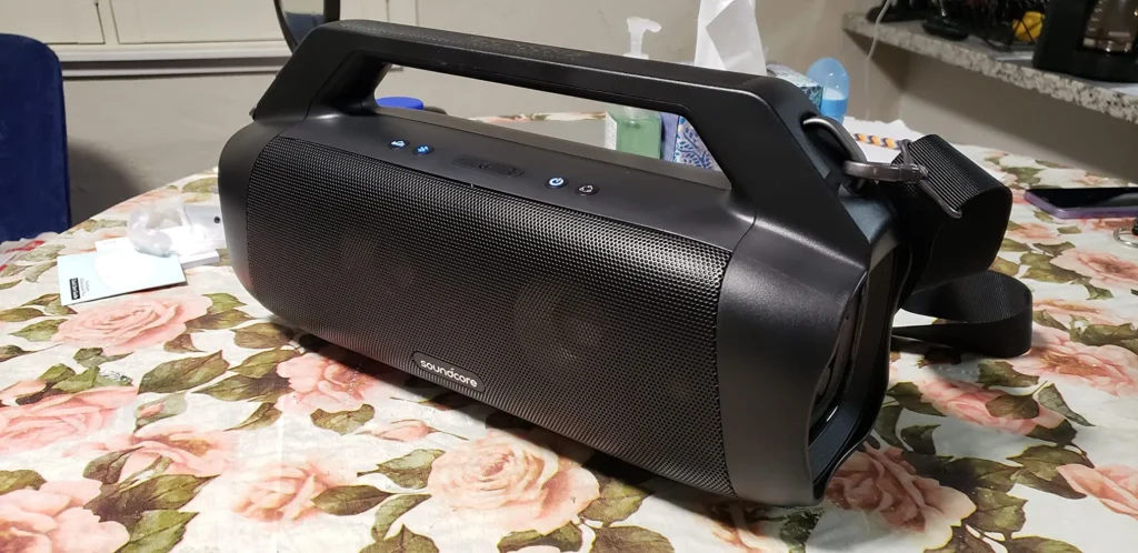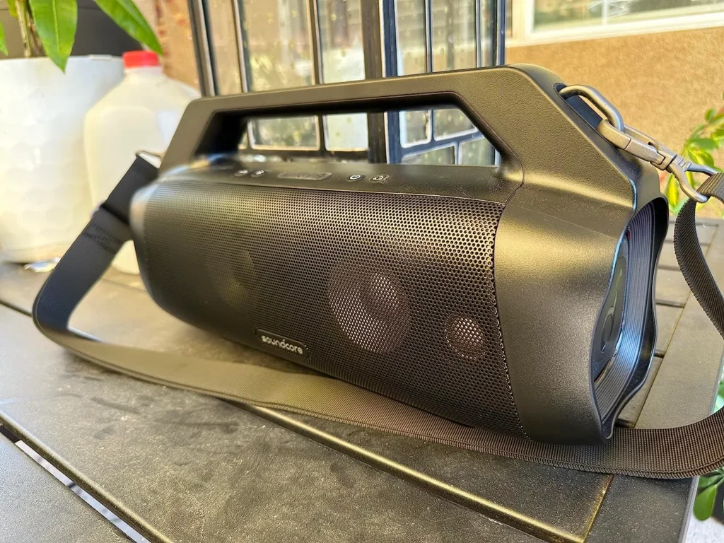 The first thing I noticed when I pulled it out of the box was how light it is for such a large unit. It weighs about five pounds which is significantly less than some of its competitors from JBL or Sony. The chassis is made of a sturdy matte plastic that feels utilitarian rather than luxury. While it does not have that premium fabric wrap found on more expensive models, the build feels like it can take a genuine beating. The integrated handle is solid and the included shoulder strap made it easy to carry alongside my cooler and tent. I also love that it is rated IP67 and actually floats in water which gave me peace of mind when we were hanging out near the riverbank.